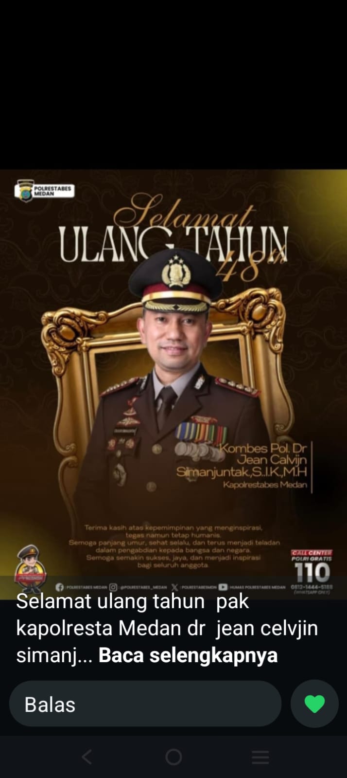 Ucapan ini disampaikan sebagai bentuk apresiasi dan penghormatan atas dedikasi serta pengabdian beliau dalam menjaga keamanan, ketertiban, dan penegakan hukum di tengah masyarakat.