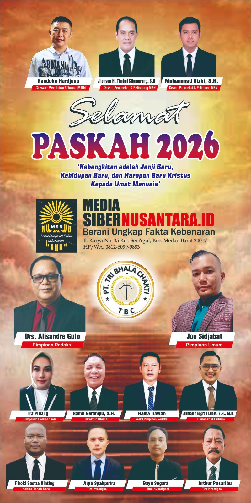 Pimpinan Umum Media Online Galaxy Monitor.id (GM), R. Brampu, SH yang akrab disapa Bram, menyampaikan ucapan selamat memperingati Hari Paskah kepada seluruh umat Kristiani di Indonesia.